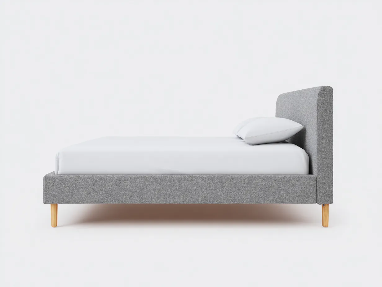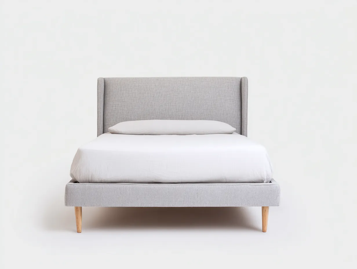 Cama individual tapizada en tejido gris claro con cabecero envolvente y patas de madera 200 x 90 x 112 cm - para dormitorio - estilo moderno y sereno