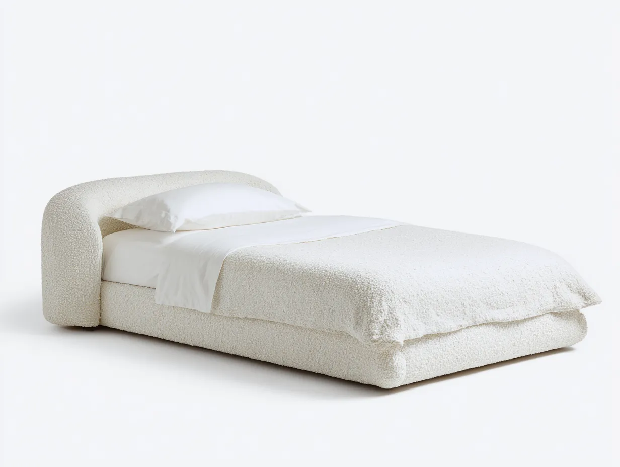 Cama individual tapizada en tejido bouclé marfil con cabecero curvo 200 x 90 x 92 cm - para dormitorio - estilo orgánico y envolvente