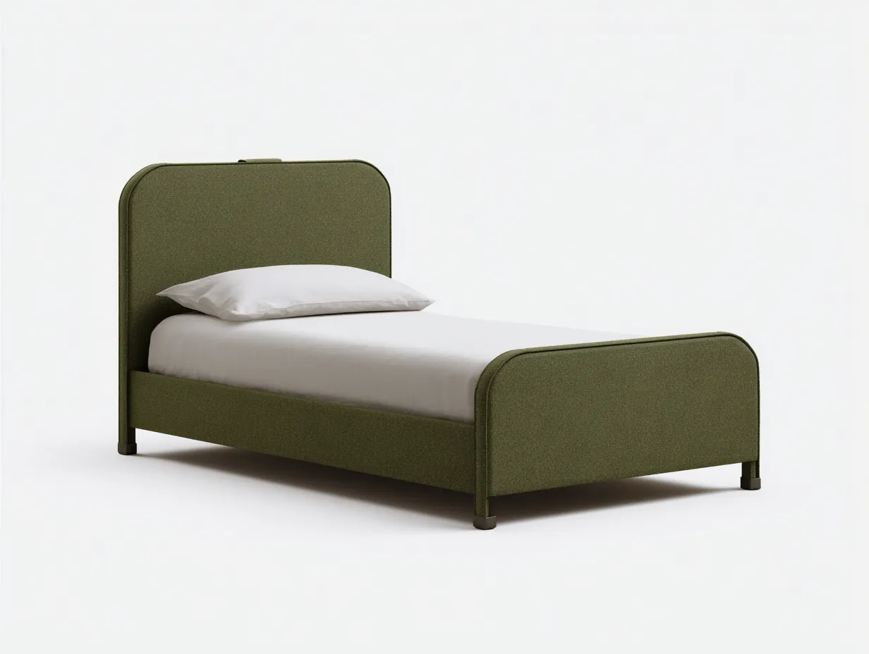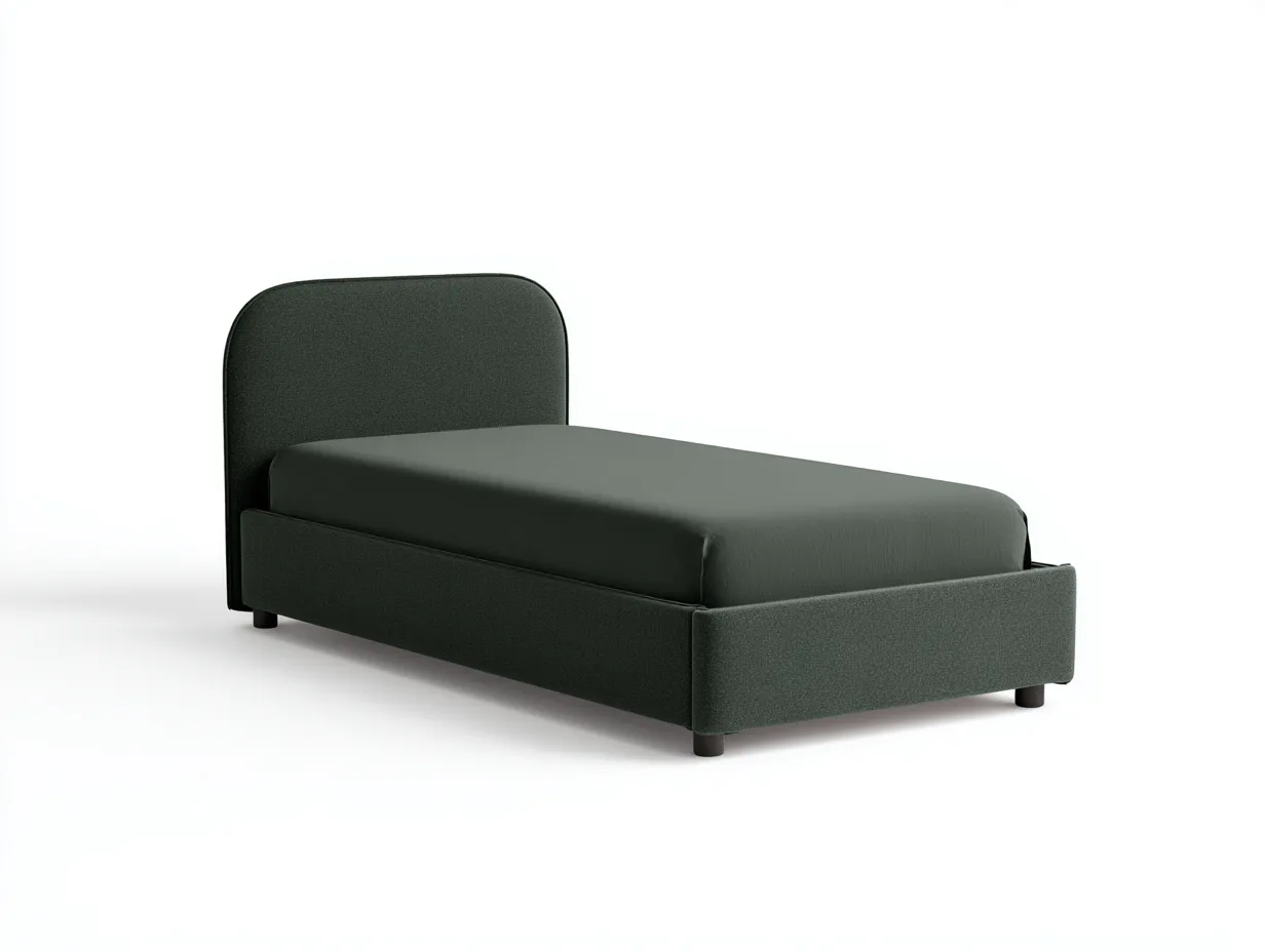 Cama individual tapizada en tejido verde oscuro con cabecero redondeado 200 x 90 x 100 cm - para dormitorio - estilo moderno y sereno