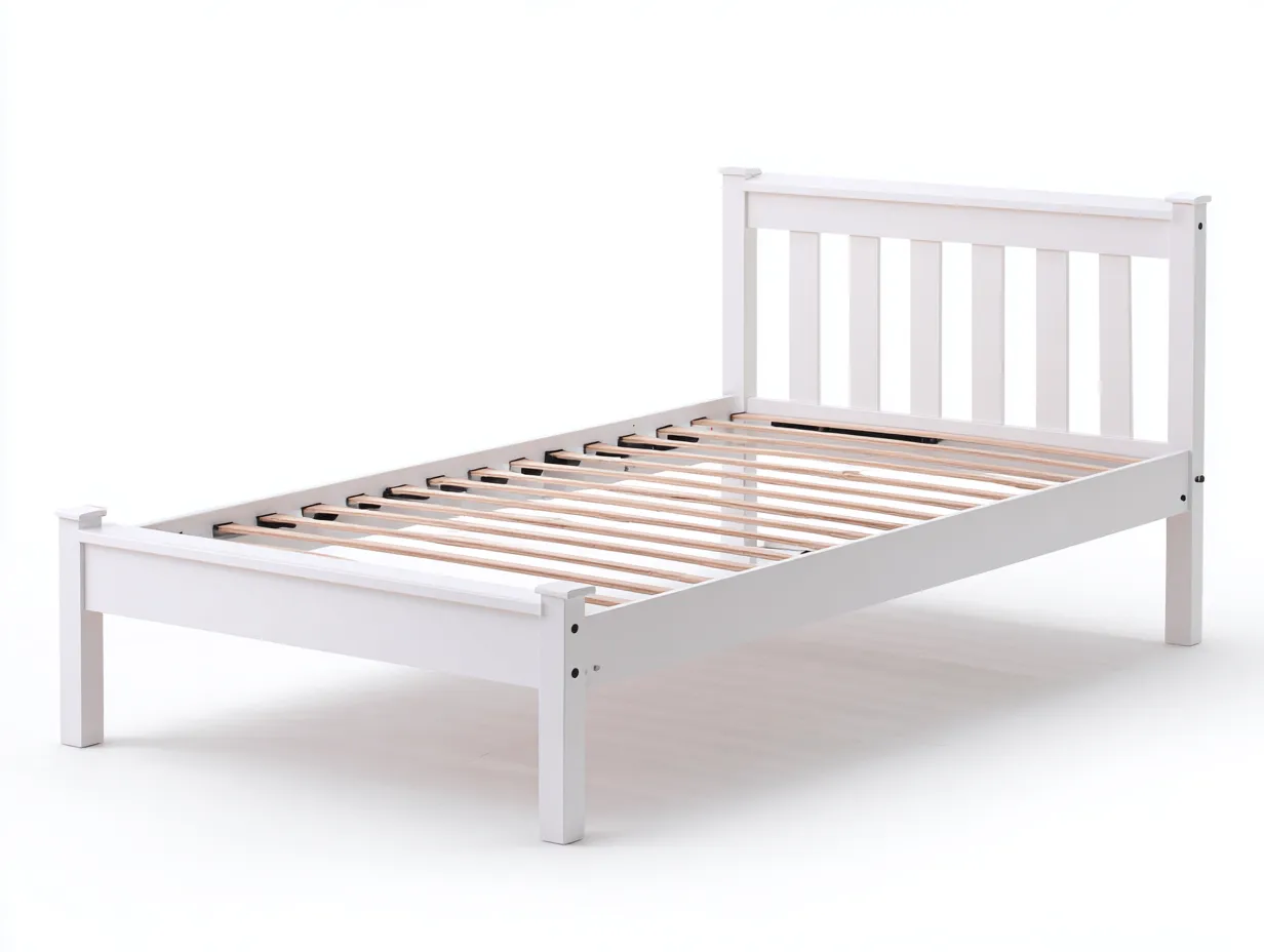 Fabricada en madera con acabado blanco, esta cama ofrece una superficie uniforme y agradable a la vista. La estructura estable, el cabecero de barrotes y el somier de láminas aportan una combinación adecuada de soporte, ventilación y durabilidad para el uso cotidiano.