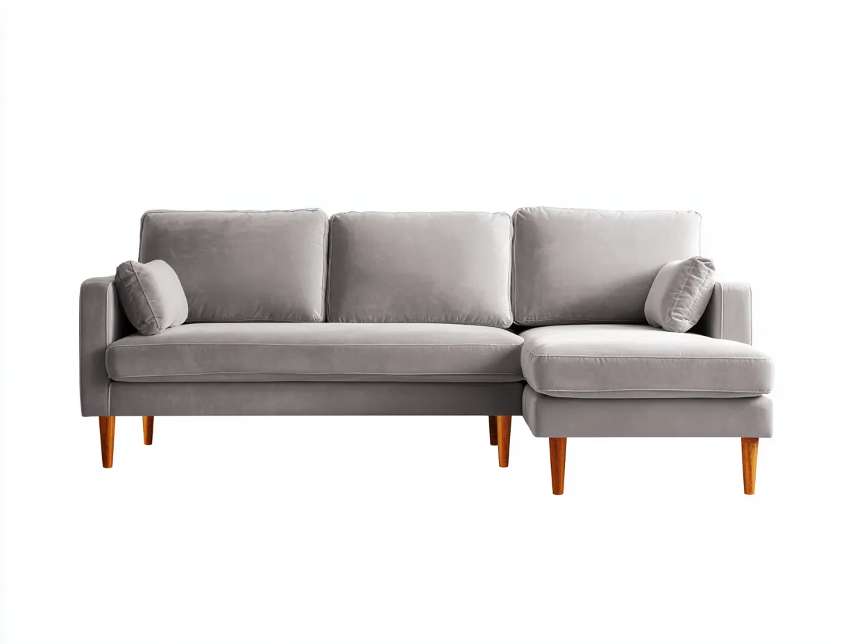 El sofá está revestido en terciopelo de color gris niebla, pensado para un uso interior habitual. La textura del tejido aporta matices visuales delicados y refuerza la sensación de suavidad del conjunto. Los reposabrazos rectos, los pequeños cojines laterales y las patas cónicas en acabado roble medio completan una composición acogedora y bien proporcionada, adecuada para un salón con estética actual y cuidada.